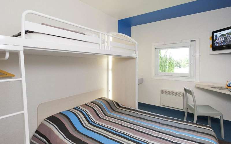 Hôtellerie économique, chambre à tarif unique pour 1, 2 ou 3 personnes avec un grand lit pour 2 personnes, 1 lit superposé pour 1 personne, 1 coin bureau, 1 TV couleur, 1 lavabo. Nous avons des chambres avec deux petits lits séparés et 1 lit superposé. Nous avons aussi 6 chambres avec douche et toilettes dans la chambre pour deux personnes.