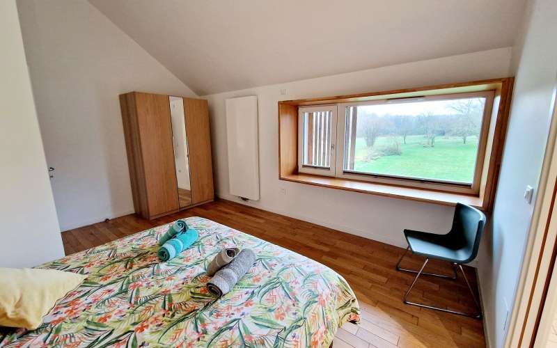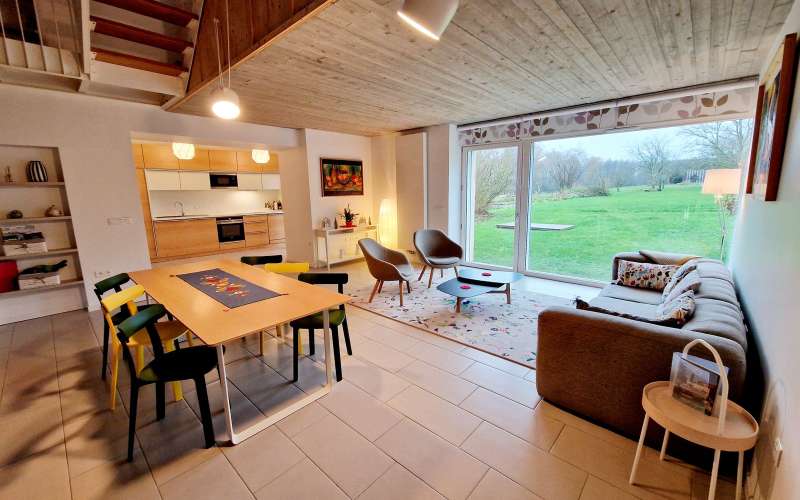 Ce gîte est un véritable loft scandinave dans une maison à colombages typique du pays des étangs. Vous apprécierez le subtil mélange de matériaux anciens et modernes. Au rez-de-chaussée grand séjour lumineux avec table de repas ; le canapé et les fauteuils sont disposés devant une immense baie vitrée donnant sur le jardin. La cuisine entièrement équipée donne directement sur une terrasse privative et couverte (salon de jardin et BBQ). A l’étage, un espace supplémentaire offre un second canapé, une table ronde et la TV grand écran. 3 chambres (lits faits) avec salles d'eau individuelles.